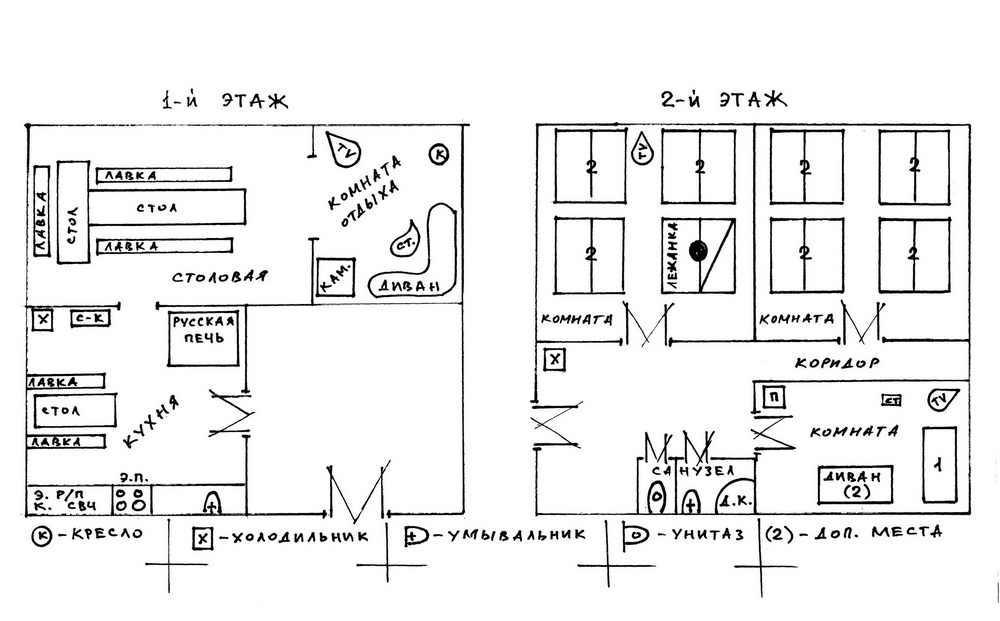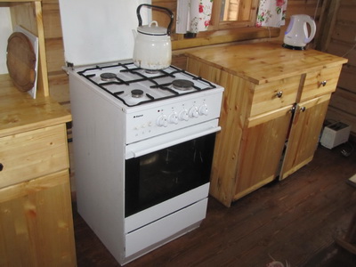 Кухня газовая плита, холодильник, русская печка кухонное оборудование и посуда на 30 чел., электрочайник, кофеварка, печь-СВЧ |